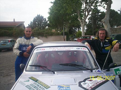 Christophe et Jean Denis , avec la nouvelle auto au rallye des fenouillèdes 2007 ( beaucoup de problèmes : support moteur coté boite de vitesse arraché (apres réparation ils pointent en retard à la sortie de l'assistance et prennent 1 min 30 de penalité),la tringlerie de boite qui a sauté plusieur fois et une durite de frein arrière qui perdait ) bref un rallye a oublier